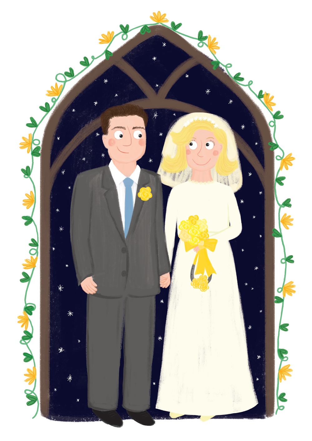 I decided recently that I would stop doing commissions for a little while as I'm working full time on events at the moment and want to dedicate any spare time I can squirrel to my new picture book. BUT. Then a good friend of mine asked me to draw something special for his parents' golden wedding anniversary so how could I say no? He wanted a picture of them on their wedding day to display at the party he had organised. What a privilege to be contributing to something so lovely and celebratory. So I put pencil to paper.